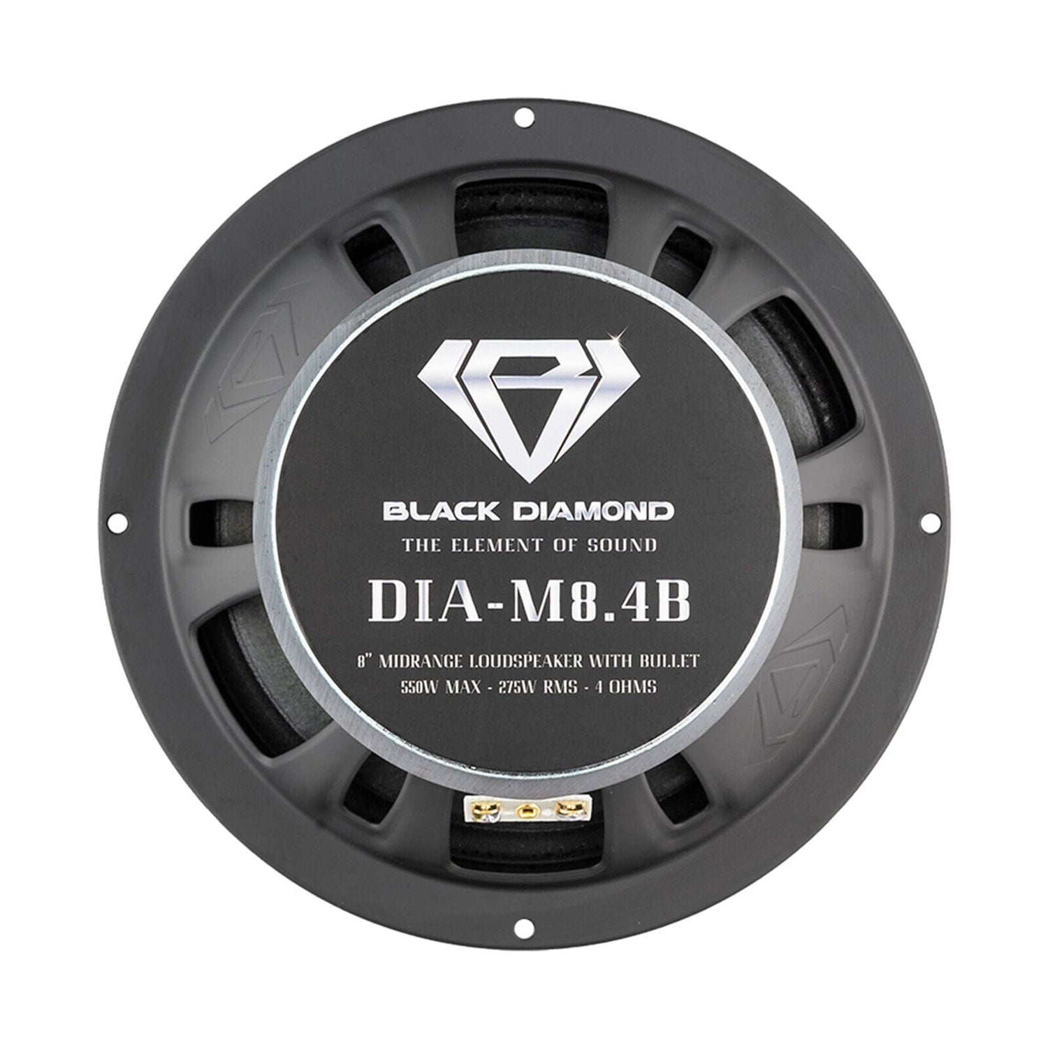 Black Diamond introduces a midrange that handles it all! A mid-range driver that can answer the call to handle the most significant part of the audible sound spectrum. A speaker that sounds great with just instrumentals and, even better with vocals. This midrange has power you can count on-the Dia-M8.4B delivers an impressive 550 Watts Max Power with 275 Watts RMS at 4 Ohms, which is enough to tackle a full range of audio. Exclusive Black Diamond design. 30oz magnet with 1.5 inch high strength voice coil for high power applications.